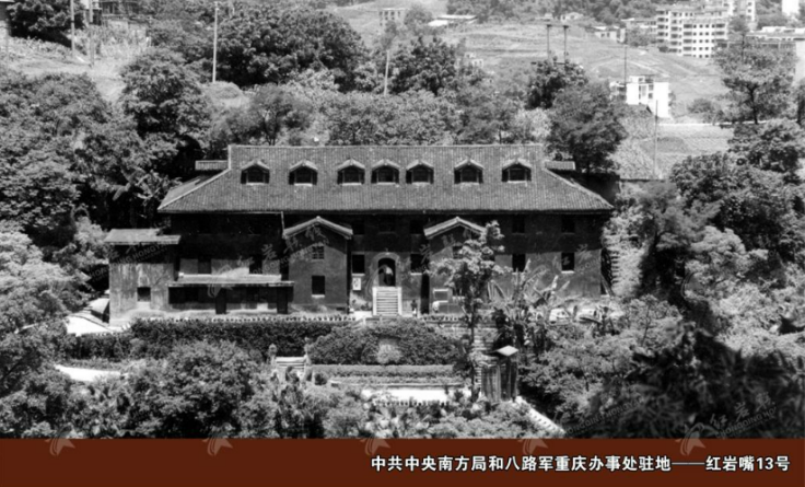 中共中央南方局暨八路军驻重庆办事处办公大楼位于重庆市渝中区红岩村52号,是一栋两楼一底的深灰色砖木结构建筑。一楼是公开机关八路军驻重庆办事处的办公场所,二楼是南方局机关和负责人的办公室兼卧室,三楼是南方局机要科和秘密电台所在地。